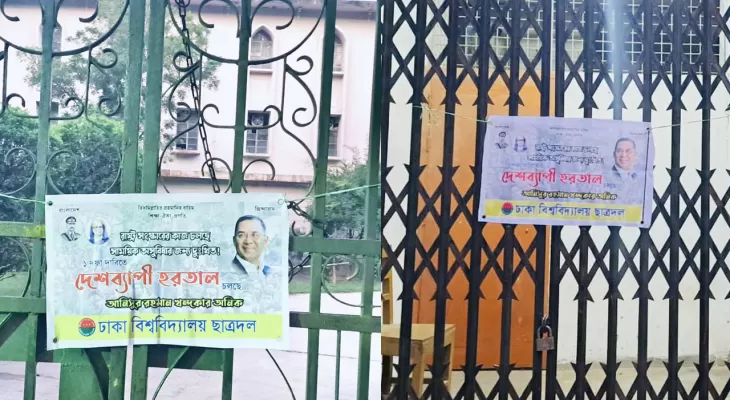 সরেজমিনে দেখা যায়, বিশ্ববিদ্যালয়ের প্রশাসনিক ভবনের গেট, মধুর ক্যান্টিন ও ডাকসুসহ বিভিন্ন স্থাপনায় তালা ঝুলছে। তালার সঙ্গে হরতালের সমর্থনে একটি ব্যানারও লাগিয়ে দেওয়া হয়েছে। ব্যানারে তারেক রহমানের ছবির সঙ্গে ‘রাষ্ট্র সংস্কারের কাজ চলছে, সাময়িক অসুবিধার জন্য দুঃখিত’, ‘এক দফা দাবিতে দেশব্যাপী হরতাল চলছে’ ইত্যাদি লেখা রয়েছে।