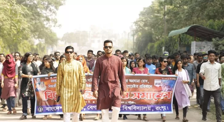 আজ বৃহস্পতিবার (৯ নভেম্বর) সকাল ১১টায় শাখা ছাত্রলীগের সভাপতি পোমেল বড়ুয়া ও সাধারণ সম্পাদক শামীম আহমেদের নেতৃত্বে বিশ্ববিদ্যালয়ের কেন্দ্রীয় ক্যাফেটেরিয়া থেকে বিক্ষোভ মিছিল শুরু হয়ে পার্কের মোড়, মর্ডান মোড় সহ গুরুত্বপূর্ণ সড়ক প্রদক্ষিণ করে পুনরায় ক্যাফেটেরিয়াতে এক সমাবেশে মিলিত হয়।