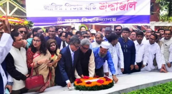 ডেস্ক: ঢাকা বিশ্ববিদ্যালয়ের (ঢাবি) নবনিযুক্ত উপাচার্য অধ্যাপক ড. এ এস এম মাকসুদ কামাল প্রায় ৮০০ শিক্ষককে নিয়ে বঙ্গবন্ধু শেখ মুজিবুর রহমানের সমাধিসৌধে পুষ্পস্তবক অপর্ণ করে গভীর শ্রদ্ধা নিবেদন করেন। গতকাল শুক্রবার টুঙ্গিপাড়ায় শ্রদ্ধা নিবেদন শেষে শহীদ সদস্যদের রুহের মাগফিরাত কামনা করে দোয়া ও মোনাজাত করেন।